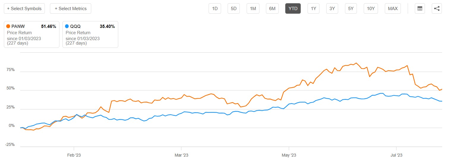 公开资料显示,Palo Alto Networks 是一家美国网络安全公司,总部位于加利福尼亚州圣克拉拉。该公司专注提供网络安全解决方案,旨在保护企业和组织免受网络攻击、恶意软件、数据泄漏和其他网络威胁的侵害。目前致力于将AI技术融入网络安全领域的Palo Alto是今年全球AI投资狂潮的最大赢家之一,年内涨幅超50%,远远超过纳斯达克100指数涨幅。