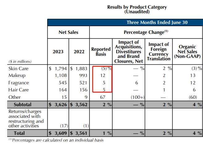 按产品类别来看,当季雅诗兰黛的皮肤护理业务的净销售额录得17.94亿美元,较2022年二季度下降了5%;公司彩妆业务同比上涨了12%,是整体营收正增长的最主要功臣,另外香水和护发业务各增长5%。