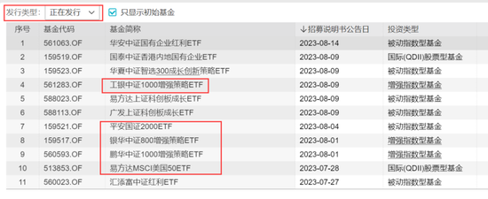 从目前正在发行的ETF来看,同样不乏行业主题和跨境类产品。比如,易方达MSCI美国50ETF于8月2日起发行。宽基指数ETF方面,正在发行的有平安国证2000ETF、工银中证1000增强策略ETF、银华中证800增强策略ETF、 鹏华中证1000增强策略ETF。另外,景顺长城国证2000ETF于9月4日起发行。而在此前,还有10家公募上报了中证2000ETF。