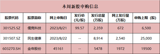 根据发行安排,儒竞科技将于本周一申购,公司发行价为99.57元/股,中一签需缴款4.98万元;民生健康将于周二申购,金帝股份将于周三申购。