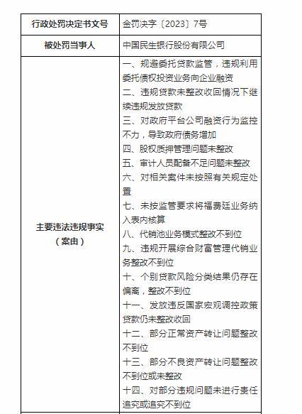 具体而言,民生银行因规避委托贷款监管,违规利用委托债权投资业务向企业融资;违规贷款未整改收回情况下继续违规发放贷款;对政府平台公司融资行为监控不力,导致政府债务增加;股权质押管理问题未整改;审计人员配备不足问题未整改;对相关案件未按照有关规定处置;未按监管要求将福费廷业务纳入表内核算;代销池业务模式整改不到位;违规开展综合财富管理代销业务整改不到位;个别贷款风险分类结果仍存在偏离,整改不到位;发放违反国家宏观调控政策贷款仍未整改收回;部分正常资产转让问题整改不到位;部分不良资产转让问题整改不到位或未整改;对部分违规问题未进行责任追究或追究不到位,共十四条违法违规事实被罚。
