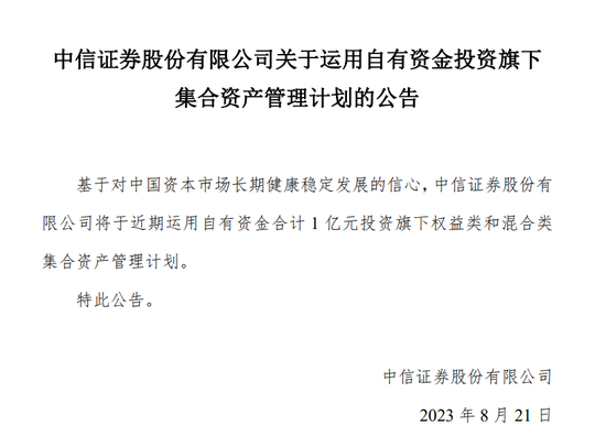 就在今天(2023年8月21日),中信证券表示,基于对中国资本市场长期健康稳定发展的信心,将于近期运用自有资金合计1亿元投资旗下权益类和混合类集合资产管理计划。