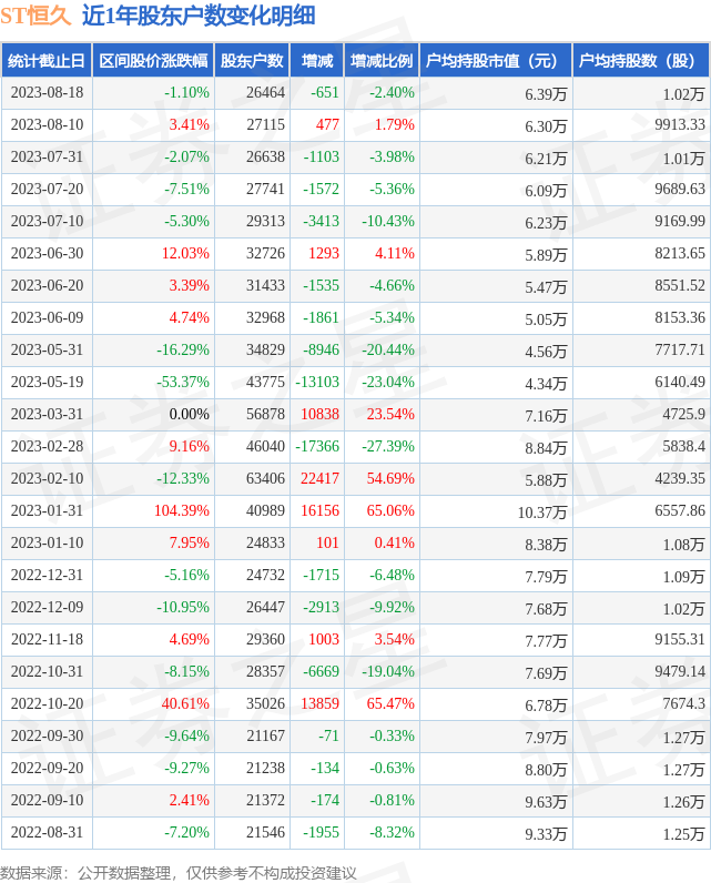从股价来看,2023年8月10日至2023年8月18日,ST恒久区间跌幅为1.1%,在此期间股东户数减少651.0户,减幅为2.4%。