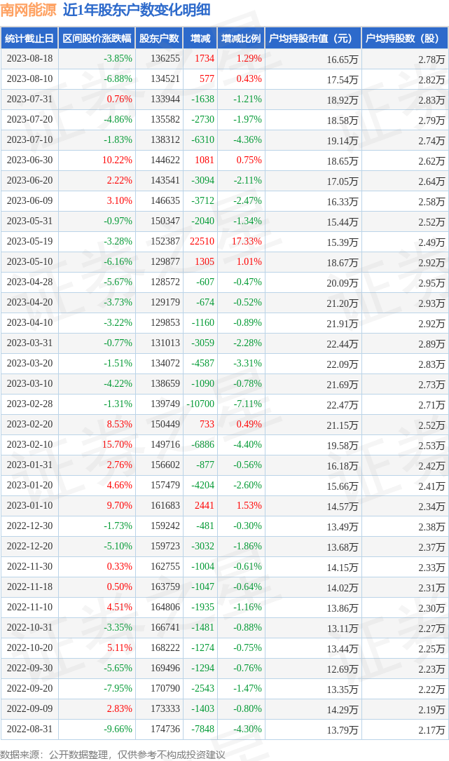 从股价来看,2023年8月10日至2023年8月18日,南网能源区间跌幅为3.85%,在此期间股东户数增加1734.0户,增幅为1.29%。