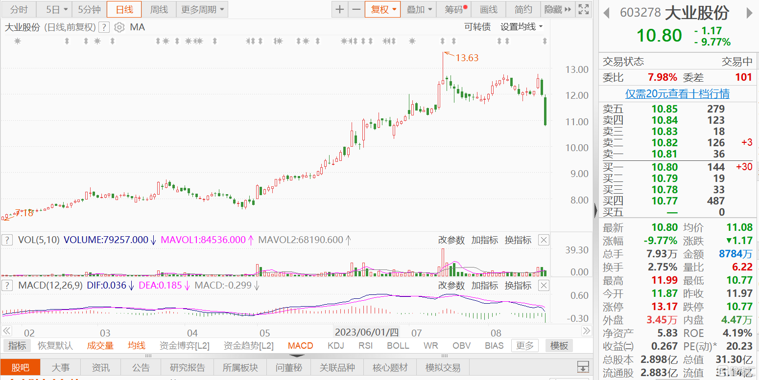 大业股份(603278.SH)逼近跌停,报10.2元,总市值31.4亿元。大业股份8月21日晚间发布公告称,公司于近期收到总经理郑洪霞女士送达的《关于减持山东大业股份有限公司股份结果的告知函》,郑洪霞女士于2023年5月26日至2023年8月18日通过集中竞价方式累计减持约180万股公司股票。本次减持计划实施完毕。