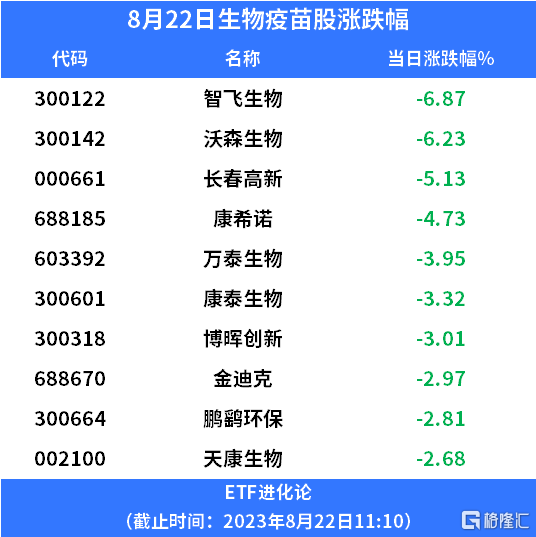 格隆汇8月22日丨疫苗股集体跳水,智飞生物、沃森生物、长春高新、康希诺、万泰生物、康泰生物跌超3%。