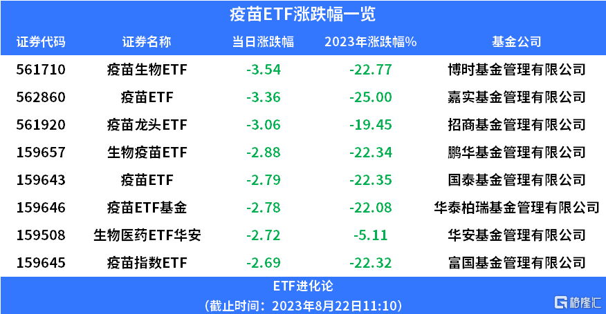 疫苗生物ETF、疫苗ETF、疫苗龙头ETF跌超3%,今年以来跌20%,生物疫苗ETF、疫苗ETF、疫苗ETF基金、 生物医药ETF华安、 疫苗指数ETF跟跌。