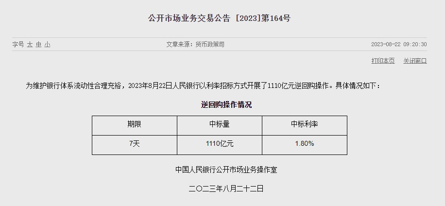 央行公告称,为维护银行体系流动性合理充裕,8月22日以利率招标方式开展了1110亿元 7天期逆回购操作,中标利率1.8%。