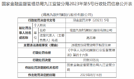 瑞昌九银村镇银行因违规发放经营贷用于购买住房被罚30万元 admin 2023-08-22 17 默认 摘要: 8月22日金融一线消息,据国家金融监督管理总局网站发布的行政处罚信息公开表显示,瑞昌九银村镇银行股份有限公司因违规发放经营贷用于购买住房,被处以罚款30万元。 此外,高志坤... 8月22日金融一线消息,据国家金融监督管理总局网站发布的行政处罚信息公开表显示,瑞昌九银村镇银行股份有限公司因违规发放经营贷用于购买住房,被处以罚款30万元。 此外,高志坤对上述违法行为负直接责任,被处以警告。 阅读 上一篇杭州皇家永利店铺招聘商务/包吃住/无费用 下一篇三部门:在沪深交易所转让创新企业CDR,由出让方按1‰的税率缴纳证券交易印花税 杭州皇家永利店铺招聘商务/包吃住/无费用上一篇 三部门:在沪深交易所转让创新企业CDR,由出让方按1‰的税率缴纳证券交易印花税下一篇 相关推荐 成都夜总会招聘员工_成都夜工作脑子灵光低要求 2025-10-13 义乌夜场ktv招聘1200模特、轻松买车买房 2025-10-13 合肥夜总会招聘女服务员-合肥夜班必上场所没有垃圾费用 2025-10-13 巴中哪家场所招聘服务员兼职[信誉优先实力团队]稳定 2025-10-13 承德豪华男.模场-夜场ktv招聘男.模-不收一分钱稳定捞金 2025-10-13 深圳夜总会招聘_深圳KTV均可提供闻鸡起舞 2025-10-13