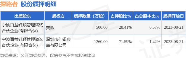 探路者(300005)8月22日公开信息显示,股东宁波百益钎顺管理咨询合伙企业(有限合伙)向龚微、深圳市佳银典当有限公司合计质押1760.0万股,占总股本1.99%。质押详情见下表:
