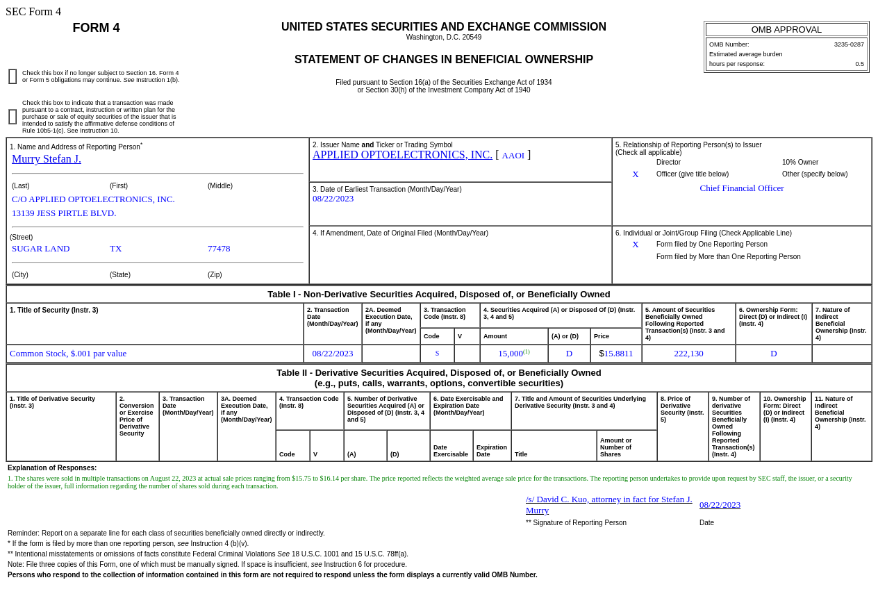 8月23日报道,根据美国证券交易委员会(SEC)8月22日披露的文件,$Applied Optoelectronics(AAOI.US)$首席财务官Murry Stefan J.于8月22日以每股平均价15.8811美元售出1.5万股普通股股份,价值约为23.82万美元。