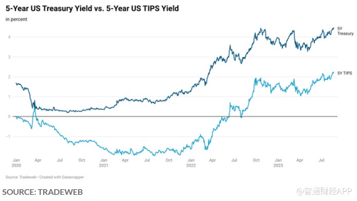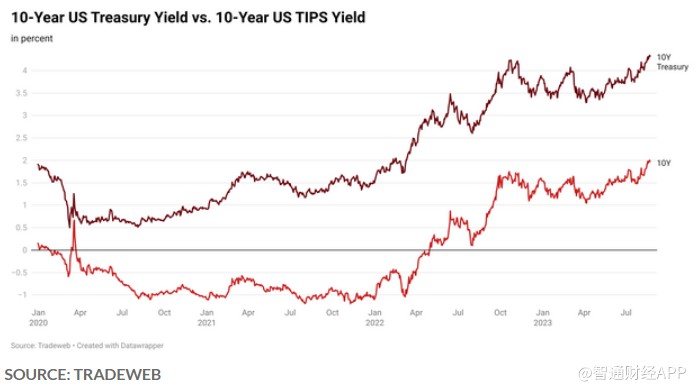 通过美国国债通胀保值债券的收益率来衡量的实际利率反映了市场对扣除通货膨胀后经济表现的看法。换句话说,它们更真实地展示了在没有通货膨胀因素的情况下,美国经济潜在的表现。目前,由于投资者对经济的”软着陆“抱有希望,实际收益率呈上涨趋势。