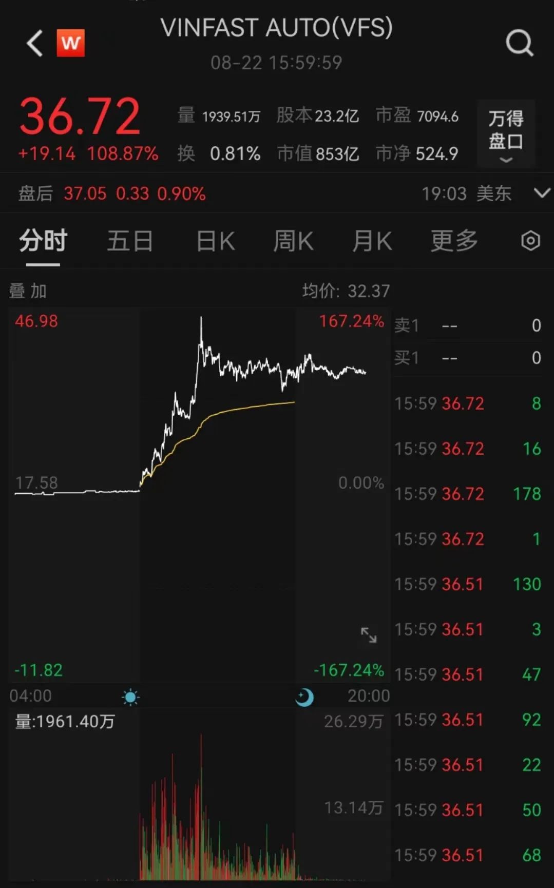 周二,越南电动汽车生产商VinFast Auto盘中上涨超167%,最高报46.98美元/股,创历史新高。公司股价收报36.72美元,涨幅为108.87%。
