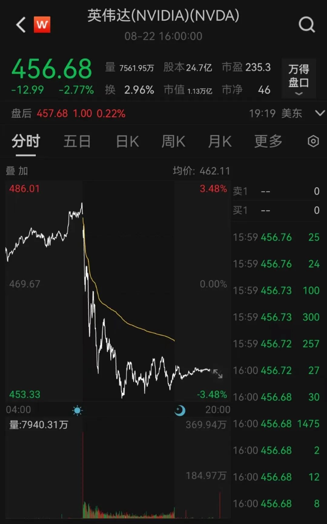 周二早盘,英伟达涨势延续,股价一度创下历史新高481美元,超过今年7月14日的高点,不过最终收跌近2.8%,收报456美元。