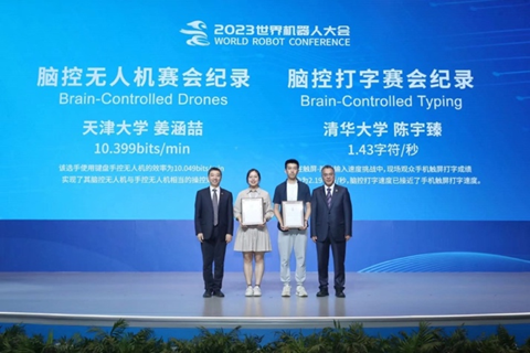 本届大会产生了两项纪录,分别是2023世界机器人大会脑控打字、脑控无人机赛会记录,北京市经济和信息化局党组书记、局长姜广智,北京经济技术开发区管委会主任孔磊为两项纪录创造者颁发证书。