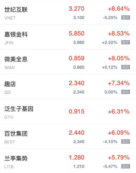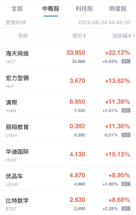 海天网络涨超22%,满帮涨超11%,优品车、比特数字、世纪互联、嘉银金科涨超8%,趣店涨超7%,兰亭集势、高途涨超5%,嘉楠科技、万国数据、虎牙、新氧、百济神州、尚德机构、名创优品、格林酒店涨超4%,大全新能源、华住酒店、老虎证券、小赢科技、携程、网易有道、百度、新东方涨超3%,中通、斗鱼、南茂科技、BOSS直聘、亿航、台积电、阿里巴巴涨超2%,哔哩哔哩、联电、奇景光电、京东、金山云、盛丰物流、能链智电、复朗集团、百家云、WSP控股涨超1%,微博、富途控股、亚朵集团涨近1%。