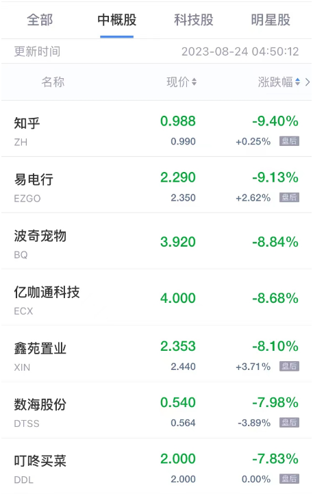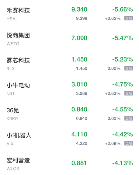 知乎、易电行跌超9%,亿咖通科技、普益财富跌超8%,叮咚买菜跌超7%,禾赛科技、雾芯科技、小牛电动、小i机器人、爱奇艺跌超4%,怪兽充电、尚乘数科跌超3%,洪恩、金融壹账通、诺亚财富、涂鸦智能、大健云仓跌超2%,挚文集团、聪链集团、途牛、艮喜生物、中阳金融跌超1%,逸仙电商、达达集团、量子之歌、汽车之家跌近1%。