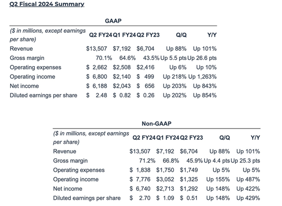 周三美股盘后,英伟达公布了该公司截至2023年7月30日的2024财年第二财季财报。报告显示,英伟达第二财季营收为135.07亿美元,与上年同期的67.04亿美元相比增长101%,与上一财季的71.92亿美元相比增长88%,创下历史纪录;净利润为61.88亿美元,与上年同期的6.56亿美元相比增长843%,与上一财季的20.43亿美元相比增长203%;不按照美国通用会计准则的调整后净利润为67.40亿美元,与上年同期的12.92亿美元相比增长422%,与上一财季的27.13亿美元相比增长148%。