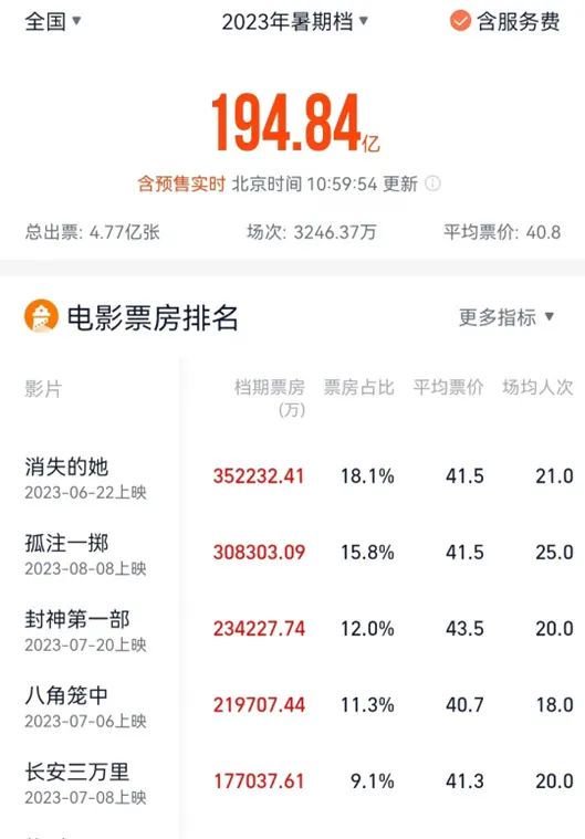 灯塔专业版数据显示,截至8月24日11时,2023年暑期档总票房近195亿元,持续刷新中国影史暑期档最高票房纪录。目前暂列暑期档票房排名前五的影片分别是《消失的她》、《孤注一掷》、《封神第一部》、《八角笼中》、《长安三万里》。