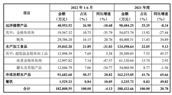 远洋捕捞产品主要为金枪鱼、鱿鱼。2019年~2021年,大洋世家鱿鱼产量占全国产量的3.75%、5.71%以及3.34%,收入分别是3.89亿元、3.29亿元以及4.44亿元。