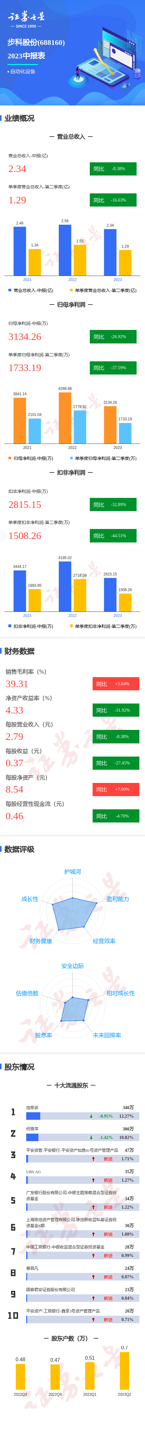 步科股份2023中报显示,公司主营收入2.35亿元,同比下降8.38%;归母净利润3134.27万元,同比下降26.92%;扣非净利润2815.15万元,同比下降32.89%;其中2023年第二季度,公司单季度主营收入1.3亿元,同比下降16.63%;单季度归母净利润1733.2万元,同比下降37.59%;单季度扣非净利润1508.26万元,同比下降44.51%;负债率20.34%,投资收益223.06万元,财务费用-328.7万元,毛利率39.31%。