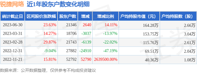 近日锐捷网络披露,截至2023年6月30日公司股东户数为2.13万户,较3月31日增加2640.0户,增幅为14.11%。户均持股数量由上期的3.04万股减少至2.66万股,户均持股市值为164.28万元。