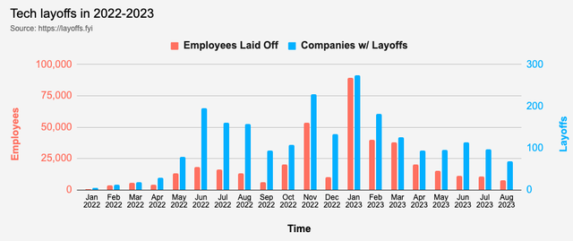 Layoffs.fyi的数据显示,今年美国科技行业中,有965家公司解雇了超过23万名员工。