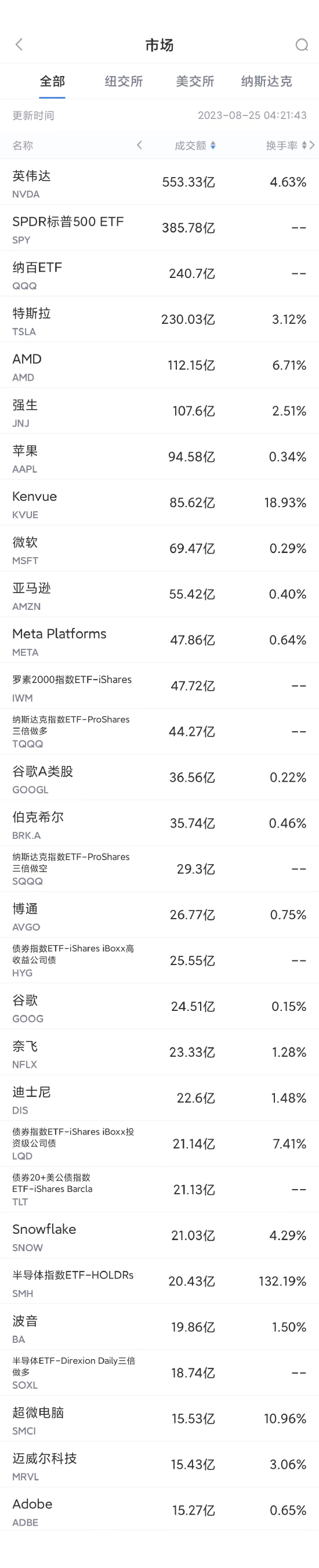第4名强生收高0.34%,成交107.6亿美元。强生公司周三正式宣布了顺利完成分拆Johnson & Johnson和Kenvue的换股要约。即日起,Kenvue将完全独立运营。两家公司将继续履行其独特的使命,为全球的病患和消费者提供创新的医疗健康产品和消费者健康产品,推动人类健康事业砥砺前行。