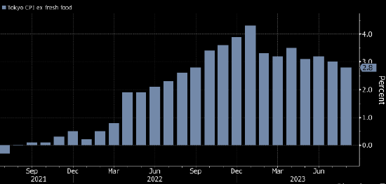 日本政府周五报告,东京8月份不包括生鲜食品的消费者价格(CPI)同比上涨2.8%,涨幅较7月份放缓,并自去年9月以来首次低于3%,也低于经济学家普遍预期的2.9%,主要是因为能源价格出现较大幅度的下跌。