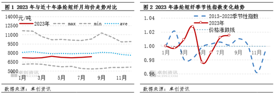 根据近十年涤纶短纤价格波动特点来看,2023年涤纶短纤价格均处在十年均值以下,8月份涤纶短纤价格向上逼近十年均值,呈震荡上涨趋势。从2023年涤纶短纤季节性指数变化来看,2023年8月涤纶短纤价格出现超季节性上涨,支撑涤纶短纤价格上涨的主要因素是成本较强。涤纶短纤主原料PTA受原油上涨及需求处于历史高位双重支撑下,价格上涨,副原料乙二醇在宏观市场政策提振及聚酯高开工驱动下价格偏暖,涤纶短纤成本支撑较强。截至8月23日,8月份涤纶短纤华东市场均价7394元/吨,环比上涨1.51%。
