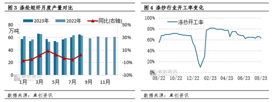 供应来看,8月江苏新增一套30万吨涤纶短纤装置出料,涤纶短纤行业月度开工水平提升至年内次高点在77%附近,月内产量预计为64.7万吨,环比提升6.85个百分点,同比提升2.13个百分点。从企业库存水平来看,与7月末相比,涤纶短纤企业理论库存天数累积到7.2天,实物库存增加至16.5天。需求来看,8月涤纶短纤需求季节性回落,其中内贸市场订单以维持老客户为主,量价齐减,纱厂开工降至66%,纱线库存累积至26天附近;外贸市场表现不佳。涤纶短纤供需压力加大,供大于求的格局下拖累价格涨幅。