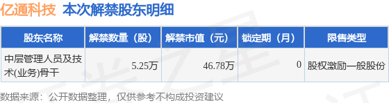 根据市场公开信息整理,亿通科技(300211)于8月25日将有5.25万股限售股份解禁上市,为公司股权激励一般股份,占公司总股本0.02%。最近一年内,该股累计解禁68.38万股,占总股本的0.23%。本次解禁后,公司还有544.04万股限售股份,占总股本1.79%。具体如下图所示: