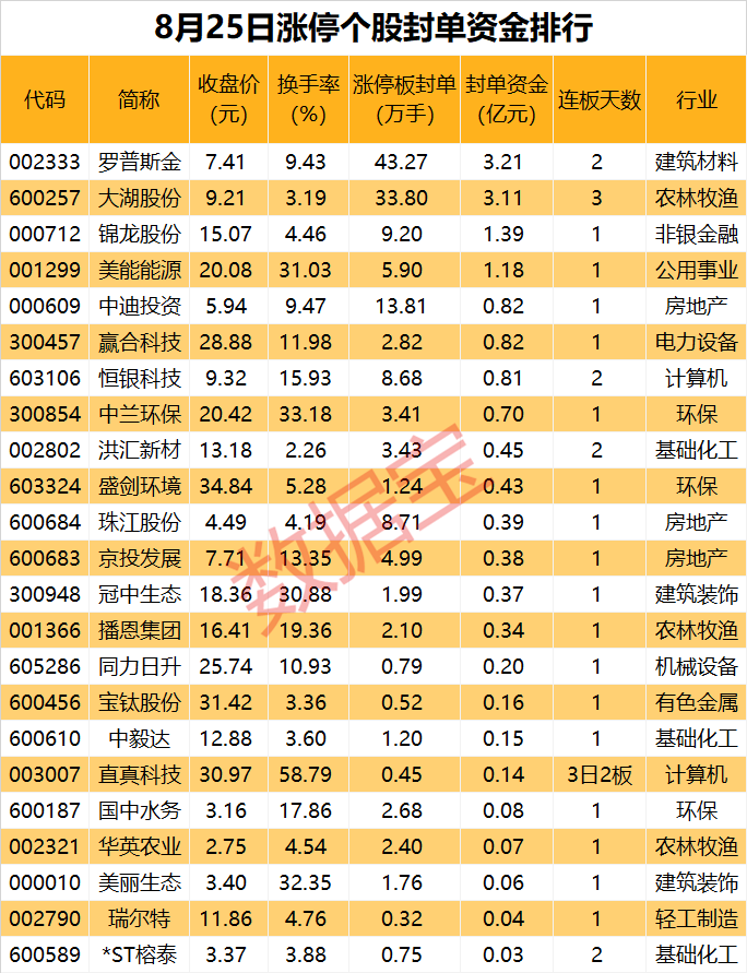 从收盘涨停板封单量来看,罗普斯金封单量最高,有43.27万手;其次是大湖股份、中迪投资、锦龙股份,涨停板封单分别为33.8万手、13.81万手、9.2万手。