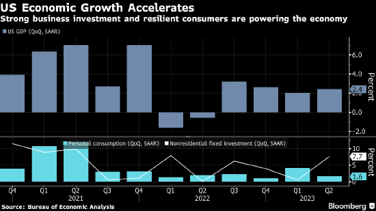 他指出,经济降温速度可能没有预期的那么快,近期的经济产出和消费者支出数据强劲。美国第二季度经济折合年率增长2.4%,表现出人意料地强劲,促使许多经济学家上调了对第三季度的预测,并重新考虑经济衰退的可能性。