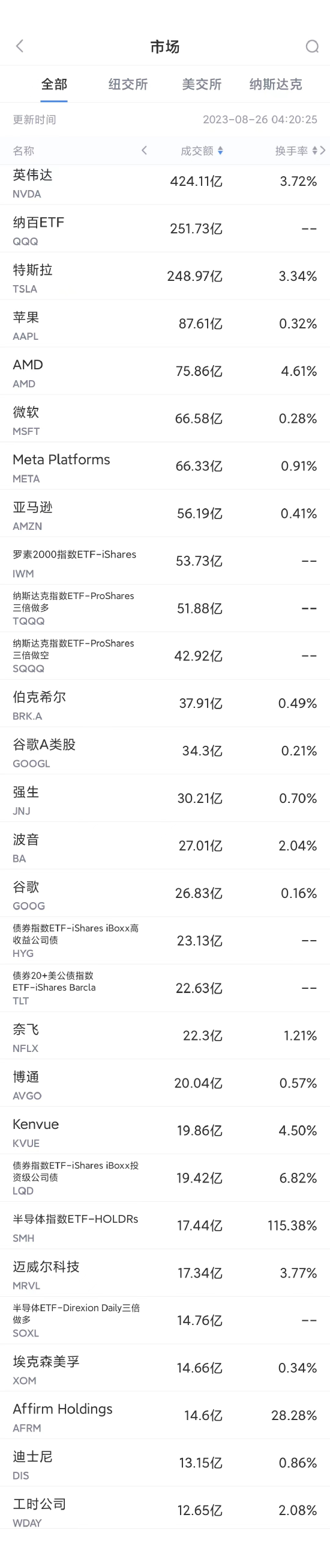 以下为美股当日交易最活跃的20只股票(按成交额):