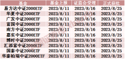 中证2000指数于8月11日正式发布,当日,十家基金公司即迅速反应,集体上报中证2000ETF产品,这批产品材料在8月16日获证监会受理,不到半个月便正式获批。