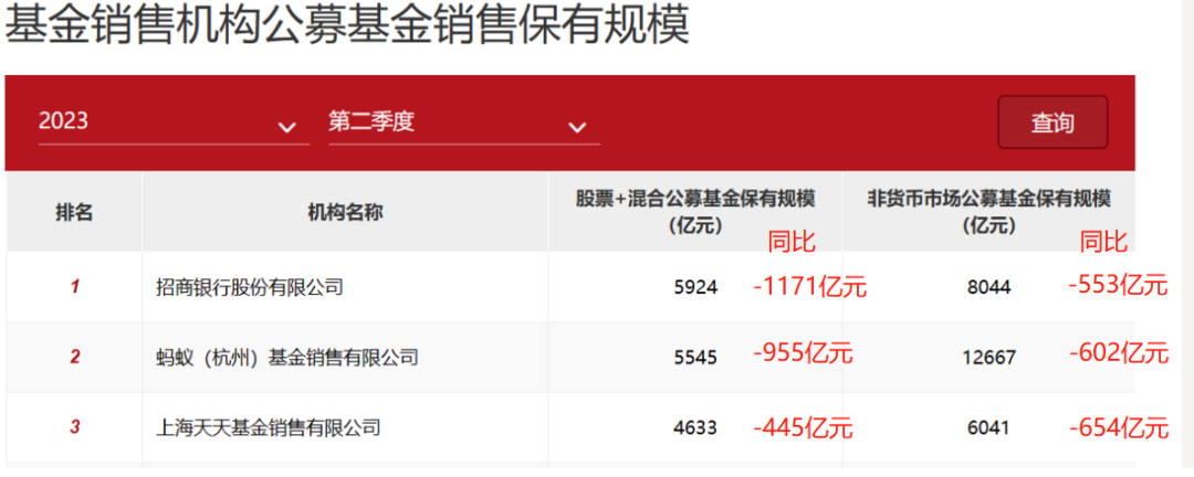 中国证券投资基金业协会官网数据显示,截至二季度末,蚂蚁基金非货币基金保有规模达12667亿元,排名基金代销机构首位,但较2022年同期的13269亿元缩水602亿元。