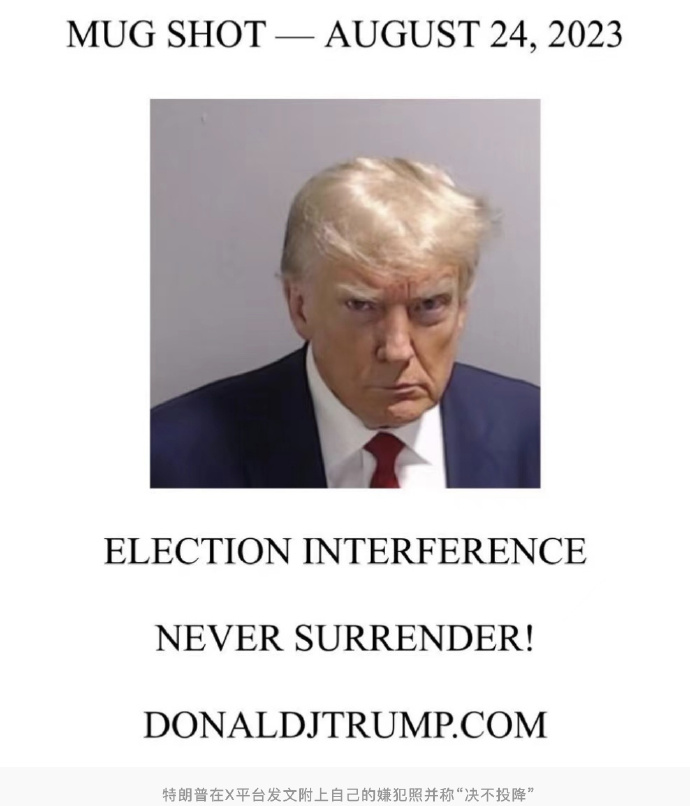 路透社称,嫌犯照中的特朗普打着红色领带,头发反着光,表情冷漠。他还重返推特(现社交平台X),附上自己的嫌犯照并称“决不投降”,截至目前,帖文已获得超2.2亿阅读,152万点赞。报道称,特朗普的支持者和竞选活动经理纷纷开始“拥抱”特朗普被捕的照片。特朗普的“拯救美国”筹款委员会正在销售“决不投降!”嫌犯照T恤衫,价格34美元(1美元约合7.2元人民币)、水杯架(15美元两个)和咖啡杯(25美元)。特朗普的儿子小特朗普正在推销“FREE TRUMP”T恤衫(29.99 美元)和海报(19.99 美元)。