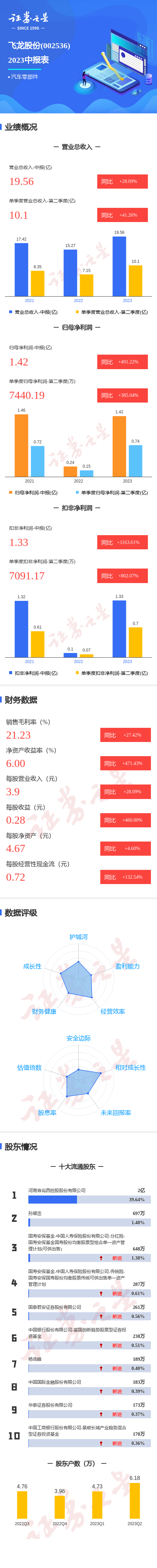 飞龙股份2023中报显示,公司主营收入19.56亿元,同比上升28.09%;归母净利润1.42亿元,同比上升491.22%;扣非净利润1.34亿元,同比上升1163.61%;其中2023年第二季度,公司单季度主营收入10.1亿元,同比上升41.26%;单季度归母净利润7440.2万元,同比上升385.04%;单季度扣非净利润7091.18万元,同比上升802.07%;负债率45.44%,投资收益-429.55万元,财务费用-440.2万元,毛利率21.23%。