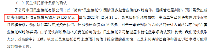而据民生信托母公司泛海控股2022年报披露信息:因涉多起营业信托纠纷案件,其管理层判断,预计需承担赔偿责任的信托项目余额为291.53亿元,到2022年底,民生信托只计提了预计负债60.98亿元,剩余一审未判决和未进入司法环节的潜在诉讼,民生信托尚未确认负债。会计师事务所对于上述情况以及未来导致的损失金额无法判定。