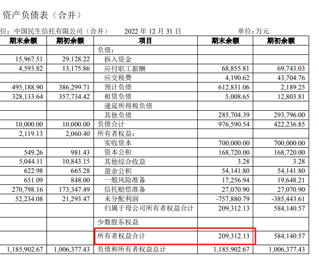 如果2022年的业绩跳水趋势不改,到2023年底,民生信托或将资不抵债。