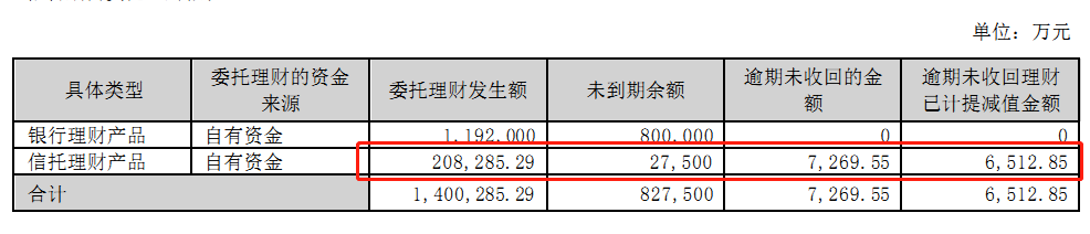 洋河2019年年报的理财信息显示,洋河所投的高风险信托理财中,有6个产品涉及民生信托。