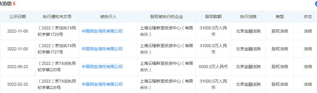在此背后,天眼查显示,民生信托持有的3.1亿元云锋新呈出资额,从2022年2月25日起,被北京金融法院多次、反复冻结,最新一期冻结从2022年11月8日起,到2025年11月7日止。