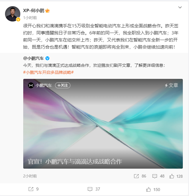 8月28日,何小鹏通过个人微博表示,“很开心我们和滴滴携手在15万级别全智能电动汽车上形成全面战略合作。昨天签约时,同事提醒我日子非常巧合。6年前的同一天,我全职投入到小鹏汽车;3年前同一天,小鹏汽车在纽交所上市;昨天,又代表我们在智能汽车全新一步的开始,既是巧合也是机遇!智能汽车的浪潮即将完全到来,小鹏会继续加速向前!”