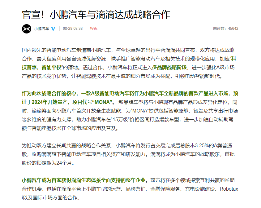 据悉,作为此次战略合作的核心,小鹏汽车将通过全新品牌,打造一款定位在15万元左右的A级智能电动汽车,并投入市场。该车预计在今年第四季度亮相,计划于2024年开始量产,项目代号“MONA”。滴滴方面将为“MONA”提供包括智能座舱、智驾及共享出行市场等多方面的支撑。
