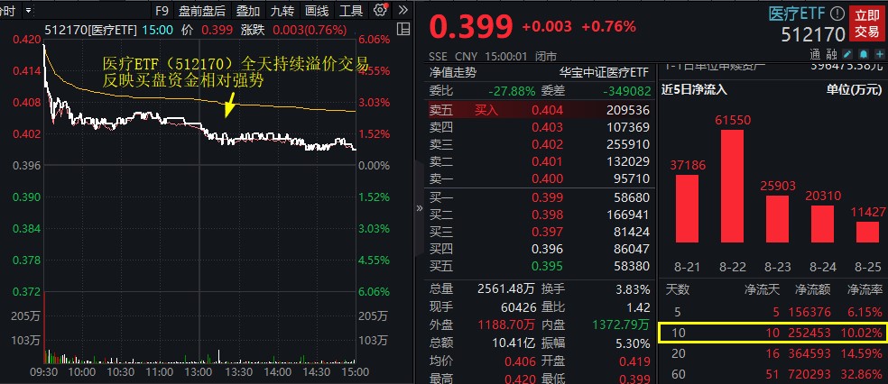从今日行情来看,尽管医疗板块高开低走,但医疗ETF(512170)场内全天维持溢价交易,反映买盘资金相对较强,结合成交大举放量来看,市场资金或继续大手笔增仓。