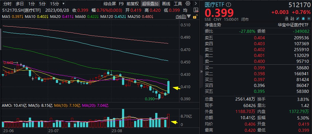 今日(8月28日)医疗板块走势与大盘几乎一致,中证医疗指数早盘跳空高开近6%,而后一路震荡下行,收盘涨幅仅剩0.66%。医疗ETF(512170)复制指数走势,盘初高开5.81%,收盘场内价格涨0.76%报0.399元,全天振幅达5.3%,10日及20日均线得而复失。场内交投异常活跃,成交10.41亿元,较上个交易日增长逾八成。