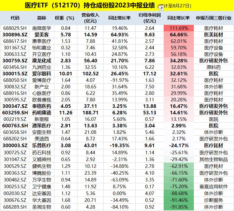 据统计,目前中证医疗指数已有28只成份股披露中报,整体来看,业绩表现较好,韧性较强。28只成份股上半年全部盈利,其中15股实现净利润两位数增长,12股净利增幅在20%以上。前十权重股中已有7股交出上半年“成绩单”,其中6股业绩正增长!爱美客净利高增64.66%,康龙化成、爱尔眼科净利增幅均超30%,泰格医药、药明康德(维权)净利分别增长16.47%、14.61%。