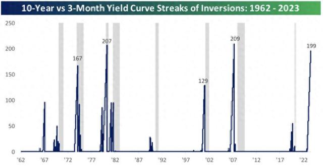 根据纽约联储早年间的研究,美国3个月期和10年国债之间形成收益率倒挂,通常是预测美国经济衰退会否到来的最佳指标之一。而如今,一组统计显示,现在距离打破过去60多年来这一曲线最长倒挂的纪录,只相隔了11个交易日——目前3个月/10年期收益率曲线的倒挂已经持续了119个交易日。这不禁引发了一些华尔街交易员的思考:史上最长的收益率曲线倒挂,对接下来的美国经济意味着什么?美国经济眼下究竟为什么还能展现出顽强的韧性呢?