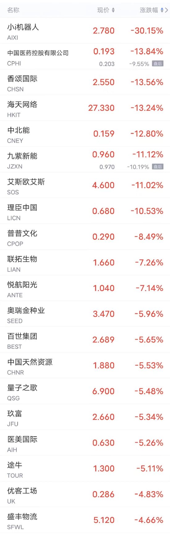小i机器人跌超30%,中国医药控股有限公司,香颂国际,海天网络跌超13%,中北能跌超12%,九紫新能,艾斯欧艾斯跌超11%,理臣中国跌超10%,普普文化跌超8%,联拓生物,悦航阳光跌超7%,奥瑞金种业,百世集团,中国天然资源,量子之歌,玖富,医美国际,途牛等跌超5%,优客工场,盛丰物流,华米,魔线,公路控股等跌超4%。